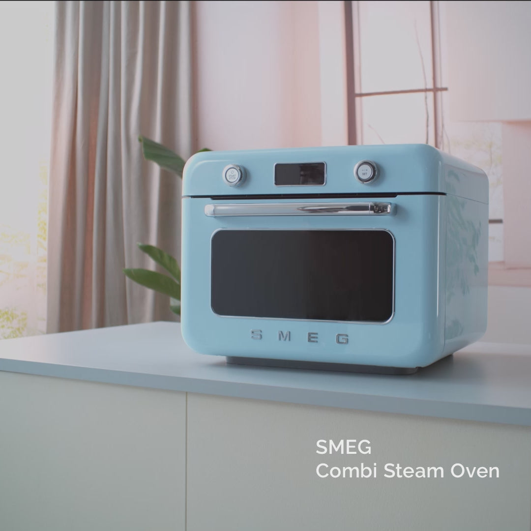 | About This Product | Introducing the COF01 countertop oven from Smeg's 50 s Style range, a perfect blend of retro aesthetics and modern technology. Inspired by the iconic FAB refrigerators, the COF01 oven features curved shapes and colours make it a standout piece in any kitchen or living space. With a 30-litre capacity and Galileo Combi-Steam technology, this oven ensures improved heat distribution for perfect cooking results. It offers ten cooking functions, including air frying, pure steam, fan assist, and Chef Mode, with 33 automatic recipes. The removable water tank provides 24 hours of continuous steam, with adjustable humidity levels from 20 to 70%. The front display alerts you when water or descaling is needed. Included accessories are a perforated tray, enameled tray, and grill. A durable QR code inside the water tank lid grants access to the Smeg Assistant portal for guides, manuals, and recipes. |