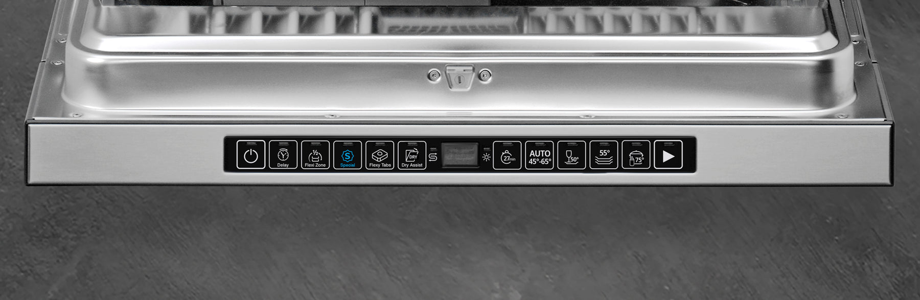 Smegs world-first planetary wash system features a single wash arm which rotates around two axes, significantly increasing wash pattern density and cleanliness. Angled jets reach in between every piece in the dishwasher for the most thorough and energy efficient wash to date. The sanitise wash program, within two hours, can clean your dishes, baby bottles, and cutting boards whilst removing 99.9% of germs. Smeg s Dry Assist system opens the door slightly at the end of the wash program. This option allows the residual heat of the machine to dry the load, including hard-to-dry items naturally and thoroughly, without the consumption of additional energy. |